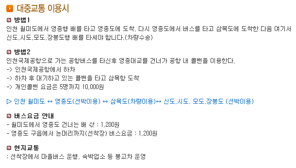 - 여객선 운임요금(편도) : 대인 3,000원 / 소인(초등학생 이하) 1,500원