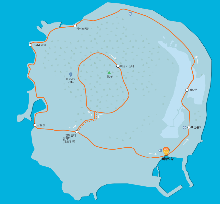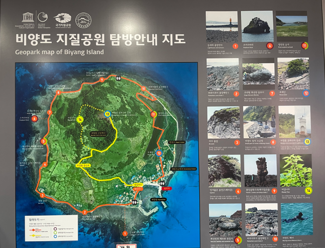 ✔️ 비양도항( 0 km) → 펄랑못( 0.4 km) → 암석 소공원( 0.6 km) → 코끼리바위( 0.3 km) → 비양도등대( 0.6 km) → 비양도항( 1.1 km) / 3.5km / 1시간 30분 정도 소요 / 난이도 하